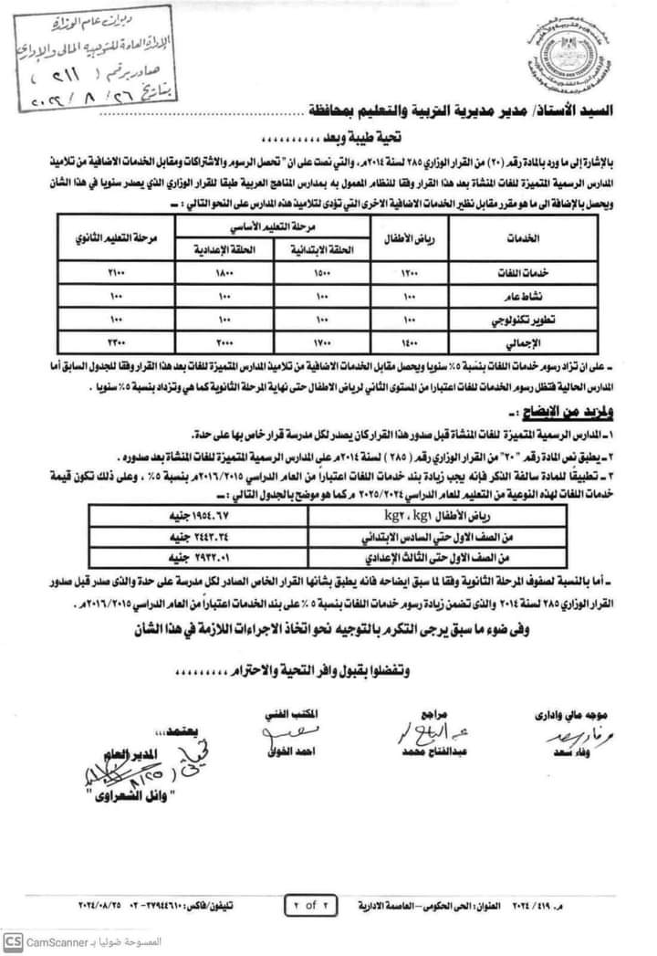 - أما المرحلة الثانوية يطبق بشأنها القرار الخاص الصادر لكل مدرسة علي حدة والذي صدر قبل صدور القرار الوزاري 285 لسنة 2014 والذي تتضمن زيادة رسوم خدمات اللغات بنسبة 5% علي بند الخدمات.