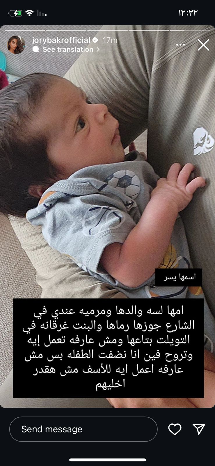 وسبق ونشرت جوري بكر صورة الطفلة عبر حسابها الرسمي بموقع إنستجرام، وعلقت: أمها لسة والداها ومرمية عندي في الشارع جوزها رماها، أنا نضفت الطفلة بس مش عارفة أعمل إيه وللأسف مش هقدر أخليهم.