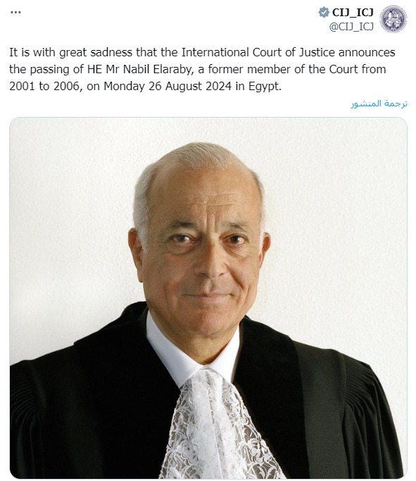 وقالت العدل الدولية، عبر حسابها على منصة إكس: تعلن محكمة العدل الدولية ببالغ الحزن والآسى وفاة السفير نبيل العربي، العضو السابق بالمحكمة من عام 2001 إلى عام 2006، يوم الاثنين الموافق 26 أغسطس 2024 فى مصر.