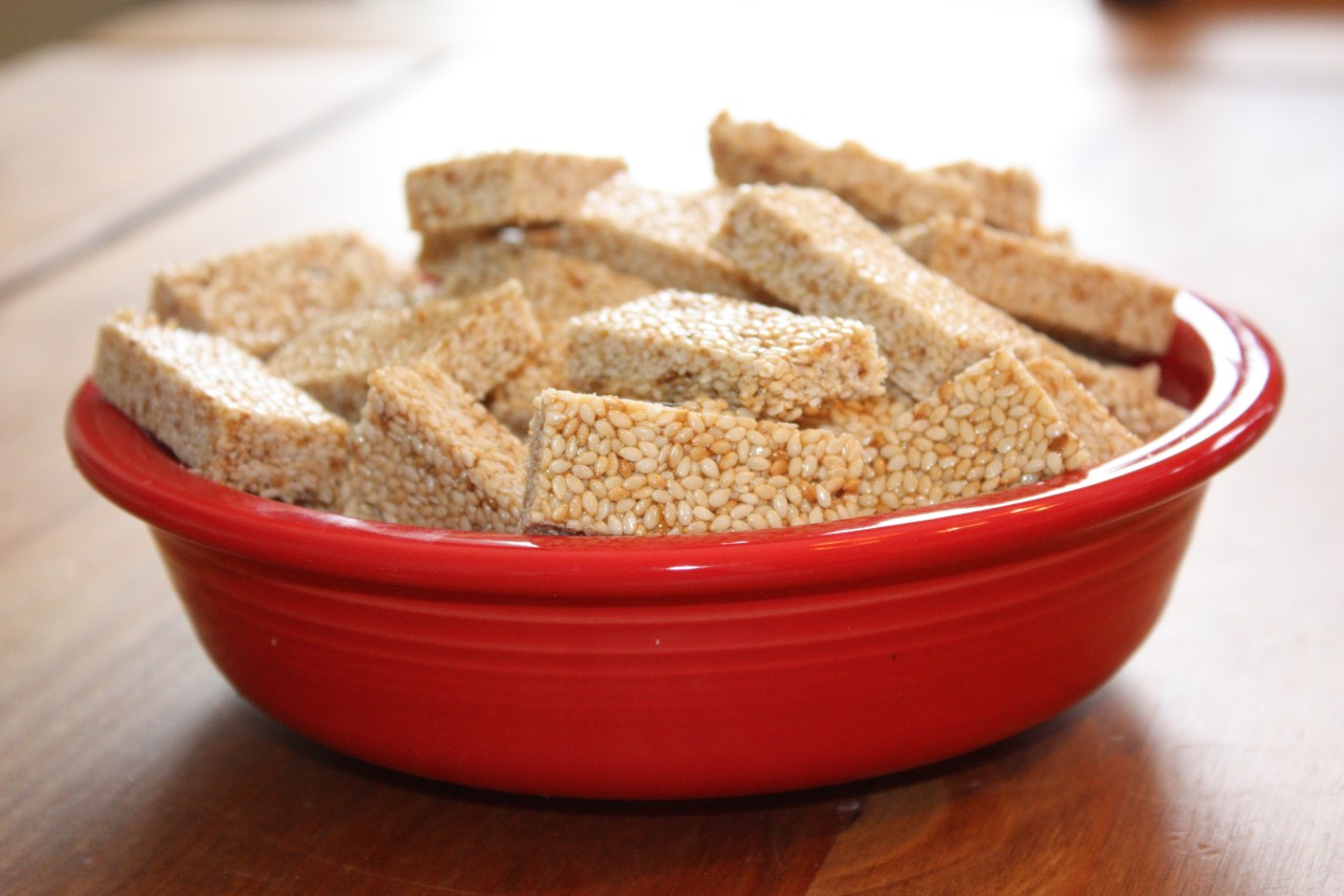 - تشكيل الأقراص: ضعي خليط السمسم في كيس بلاستيكي ومدّديه باستخدام الشوبك أو أي أداة مستوية للحصول على سمك متساوٍ. قصّي الأقراص بالشكل المفضل.