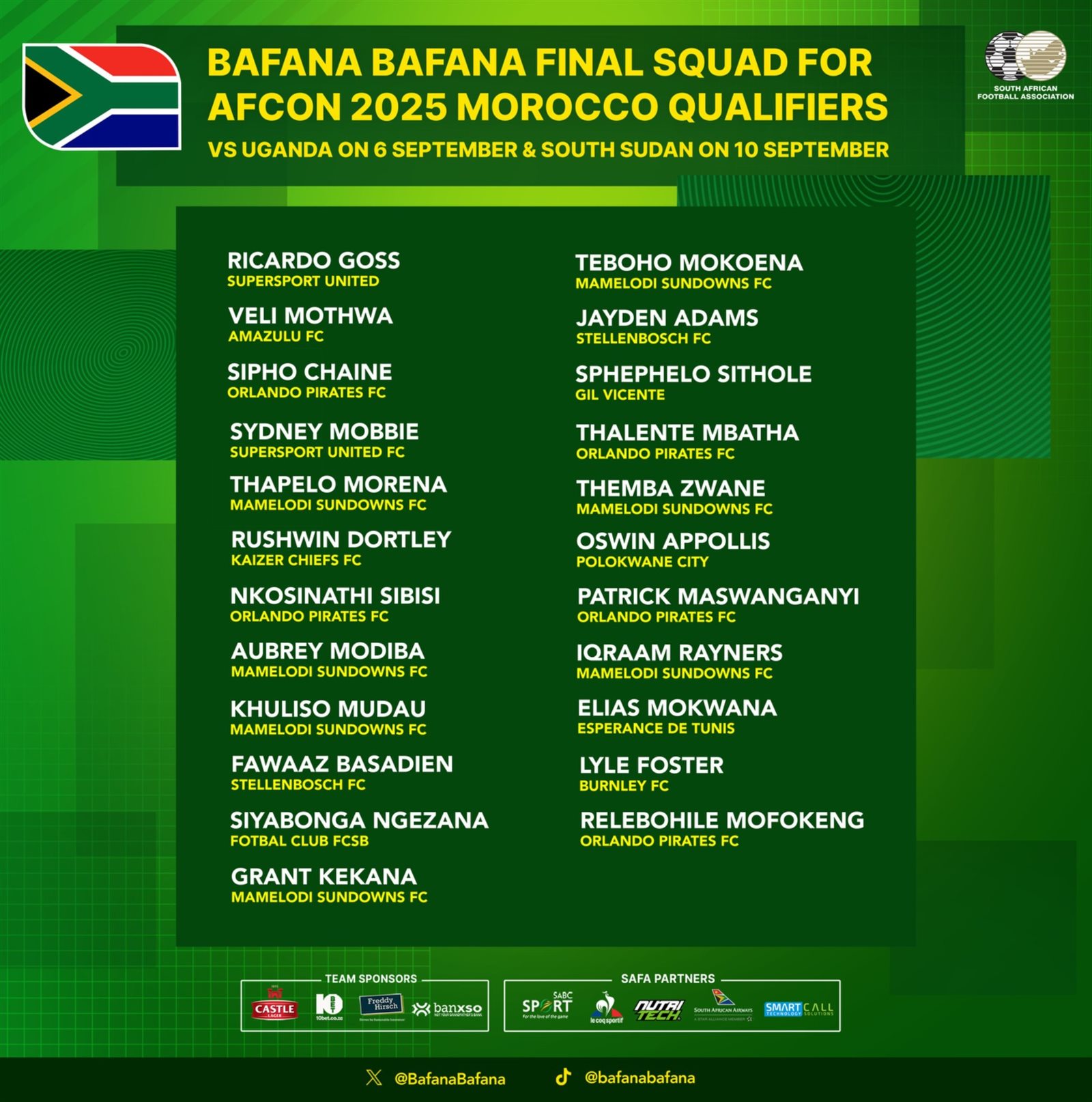 قائمة جنوب إفريقيا لمواجهتي أوغندا وجنوب السودان