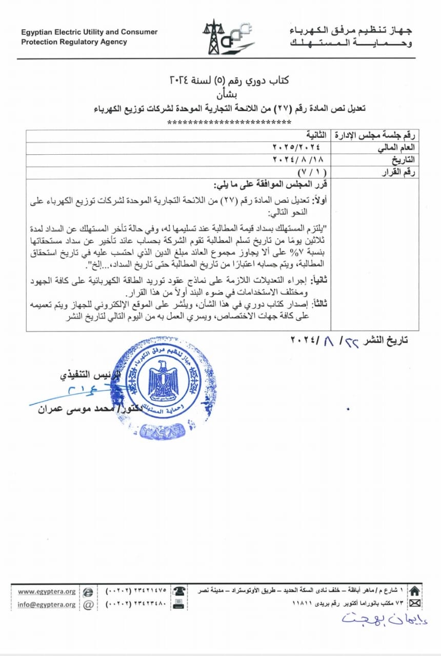 أقر جهاز تنظيم مرفق الكهرباء وحماية المستهلك، في جلسته بتاريخ 18 أغسطس، تعديل نص المادة رقم 27 من اللائحة التجارية الموحدة لشركات توزيع الكهرباء.