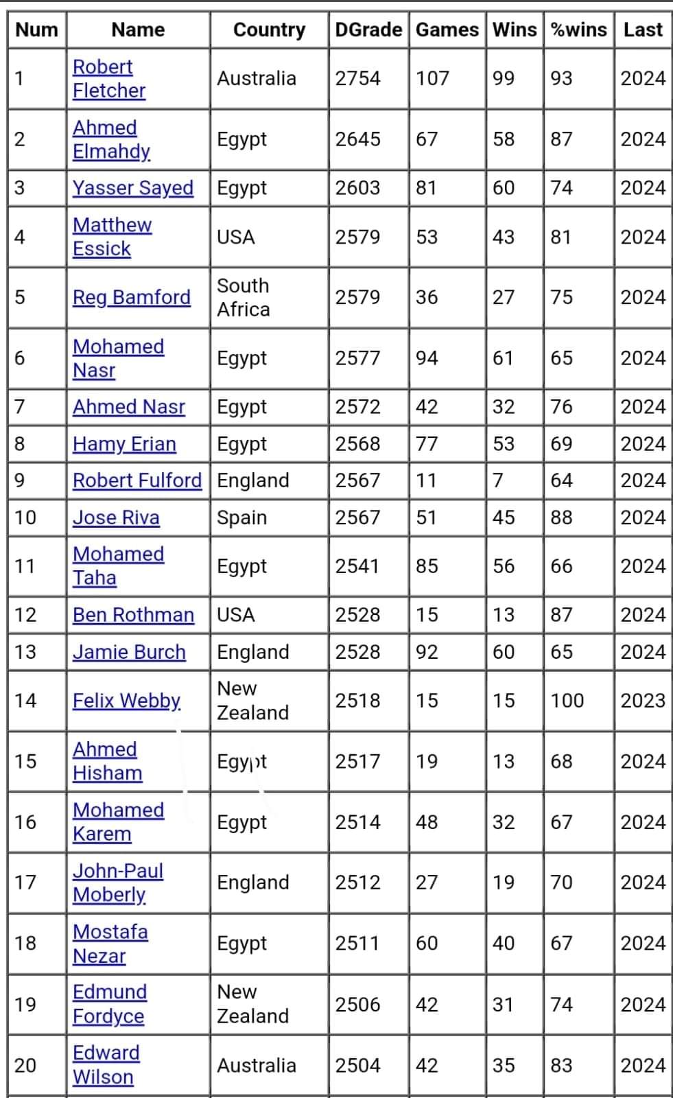 وأضاف: أما على مستوى اللاعبين، فكان لمصر نصيب الأسد، إذ تميزت مصر بخمس لاعبين في ترتيب اللاعبين العشرة الأوائل، وأيضا جاءت بـ 9 لاعبين في أول عشرين مركز، فاحتل بطل العالم فوق الخمسين أحمد المهدي المركز الثاني وياسر سيد المركز الثالث ومحمد نصر المركز السادس وأحمد نصر المركز السابع وهامي عريان المركز الثامن، بينما جاء محمد طه بطل بطولة مصرالدولية في نسختها الأخيرة 2023 في المركز الـ11، وجاء أحمد هشام في المركز 15 ومحمد كارم في المركز 16 ومصطفى نزار في المركز الـ18.
