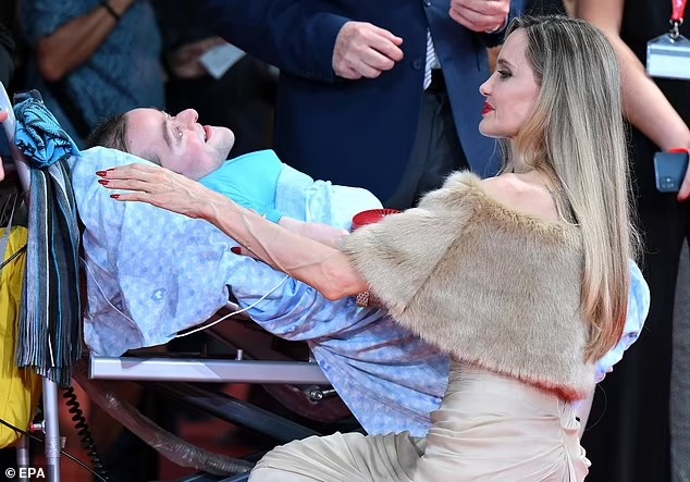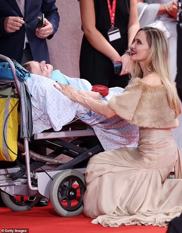 موقف إنساني من أنجلينا جولي خلال لقائها معجبا مصابا بضمور في مهرجان فينيسيا| فيديو