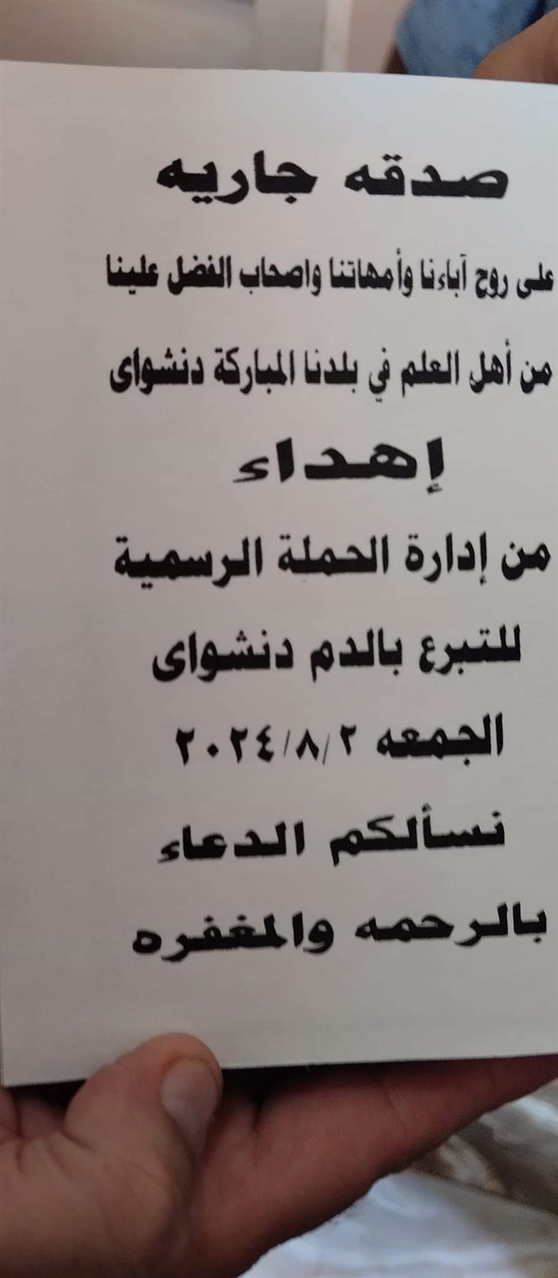 ونظم شباب قرية دنشواي حملة تبرع بالدم أعلى مسجد عمر بن الخطاب، وحددوا موعد بعد صلاة الجمعة لتجمع أهالي القرية، حيث تم التنسيق مع مسؤولي بنك الدم الإقليمي لإرسال قافلة للإشراف على عملية التبرع، وحفظ الدم ونقلها لمقر البنك بشبين الكوم.