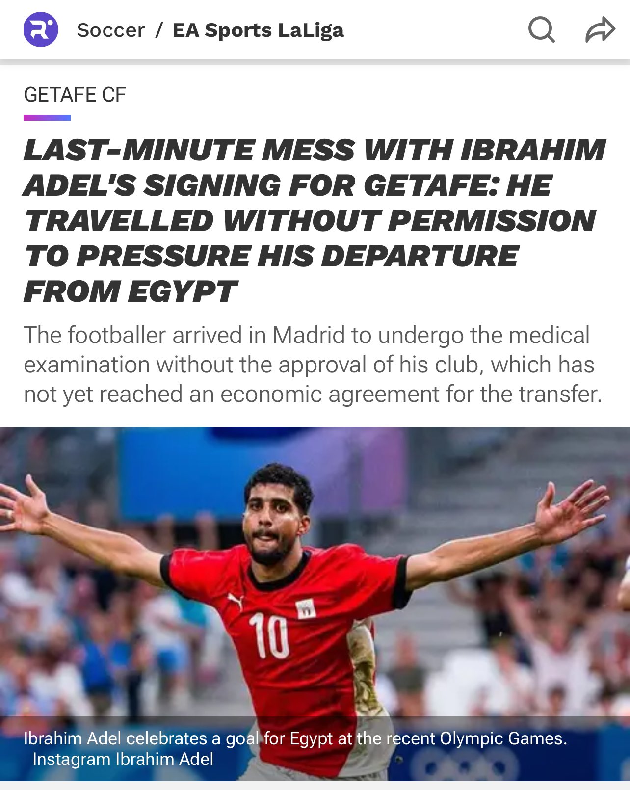 وأوضحت أن النادي الإسباني بحاجة إلى تدعيم خط الهجوم، وسيكون لديه حتى الساعة 11:59 مساء اليوم، ليتمكن من التوقيع مع إبراهيم عادل، وإلا سيعود اللاعب إلى مصر، مشددة على أن تصرفاته المتسرعة للعب في صفوف خيتافي بأي طريقة، لم تكن الأنسب لتسهيل الاتفاق بين الجانبين.