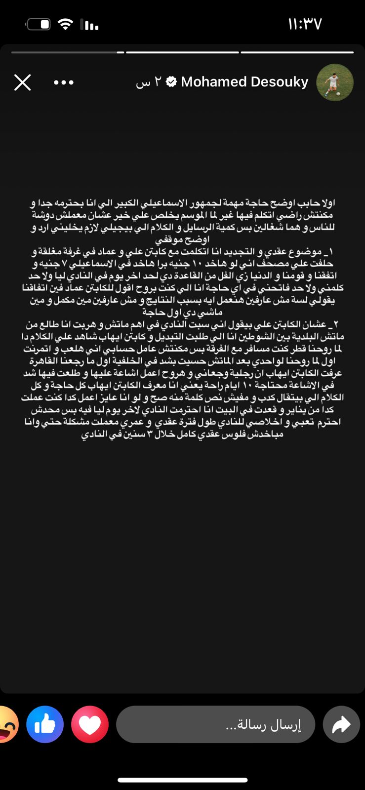 وكتب دسوقي على صفحته الشخصية بموقع التواصل الاجتماعي فيس بوك: أولا حابب أوضح حاجة مهمة لجمهور الإسماعيلي الكبير اللي أنا بحترمه جدا، ومكنتش راضي أتكلم فيها غير لما الموسم يخلص على خير عشان معملش دوشة للناس وهما شغالين بس كمية الرسايل والكلام اللي بيجيني لازم يخليني أرد وأوضح موقفي.