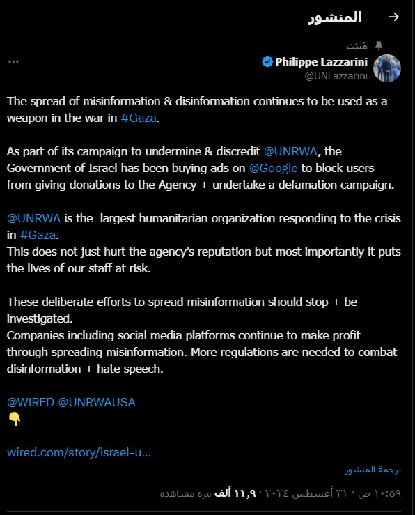 وأضاف لازازرييني في منشور له على موقع التواصل الاجتماعي X توتير سابق، إنه لا يزال نشر المعلومات المضللة والمغلوطة يُستخدم كسلاح في الحرب بقطاع غزة، كجزء من حملة إسرائيل لتقويض وتشويه سمعة الأونروا.