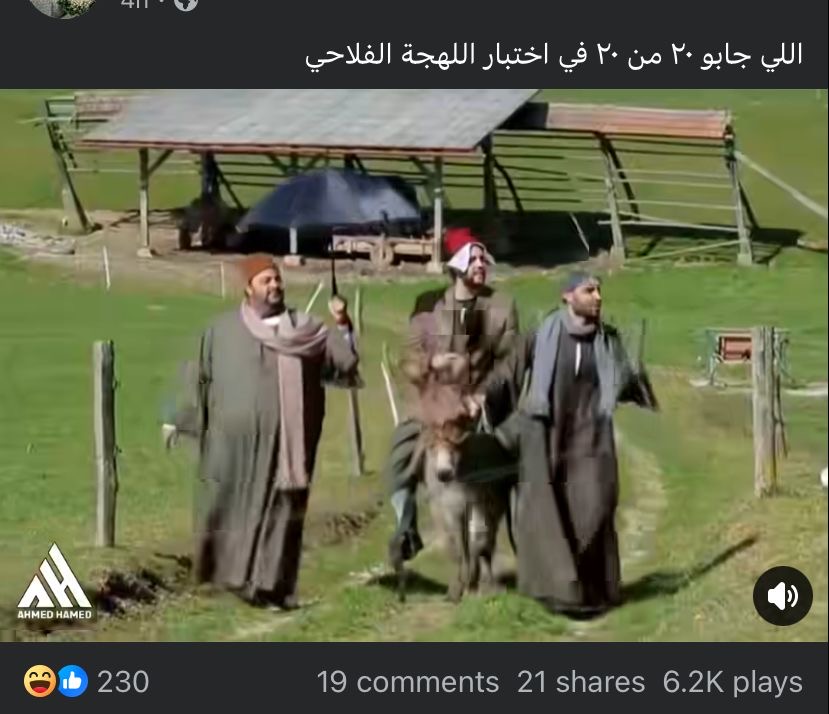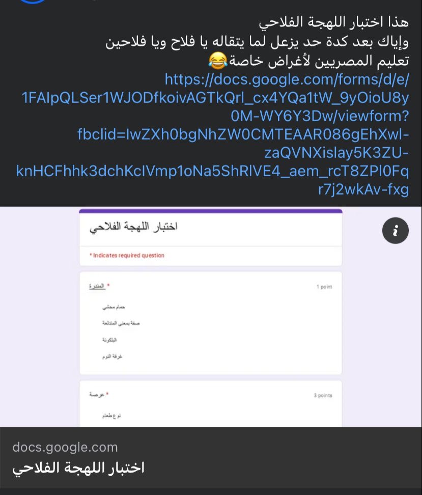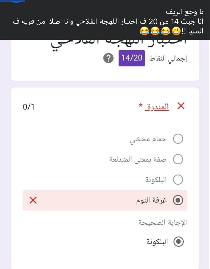 تداول مستخدمو مواقع التواصل الاجتماعي، عددا من المنشورات خلال الساعات القليلة الماضية، حول اختبار اللهجة الفلاحي، والذي يتضمن عدة أسئلة حول اللهجة الفلاحي وعن مسميات الأشياء، وفي نهاية اختبار اللهجة الفلاحي تظهر الدرجة النهائية.