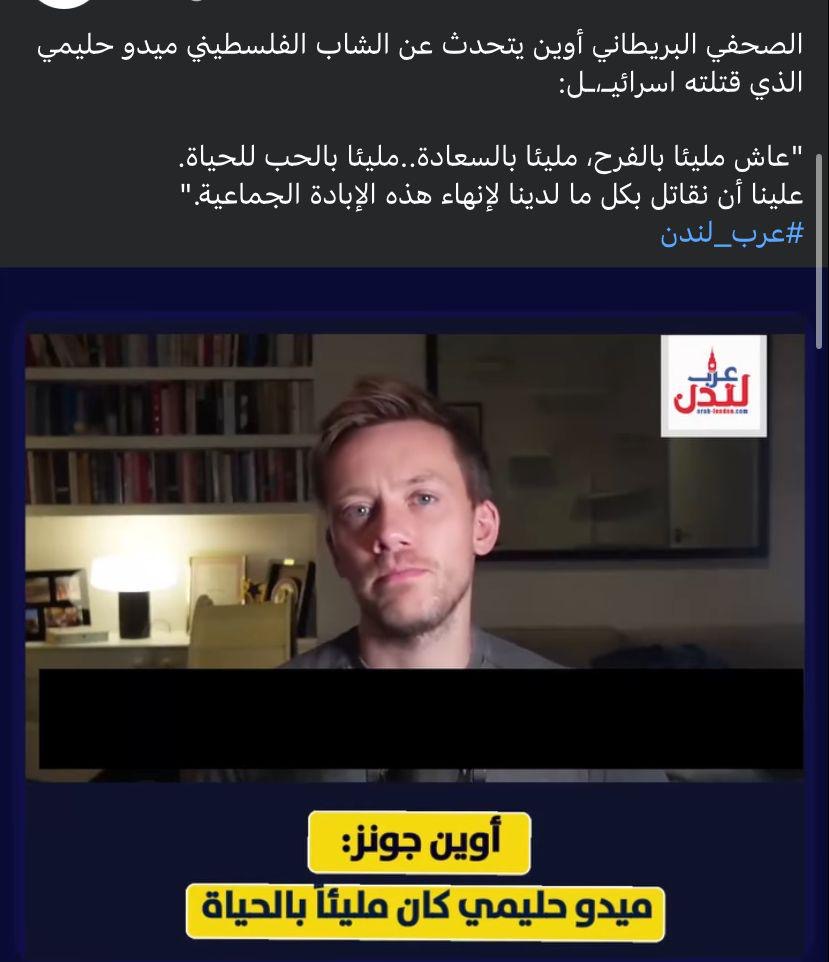 ونعى الصحفي البريطاني أوين جونز، وفاة ميدو حليمي صانع المحتوى الفلسطيني، حيث قال في مقطع فيديو له، عاش مليئًا بالسعادة.. مليئًا بالحب للحياة، علينا أن نقاتل بكل ما لدينا لإنهاء هذه الإبادة الجماعية.