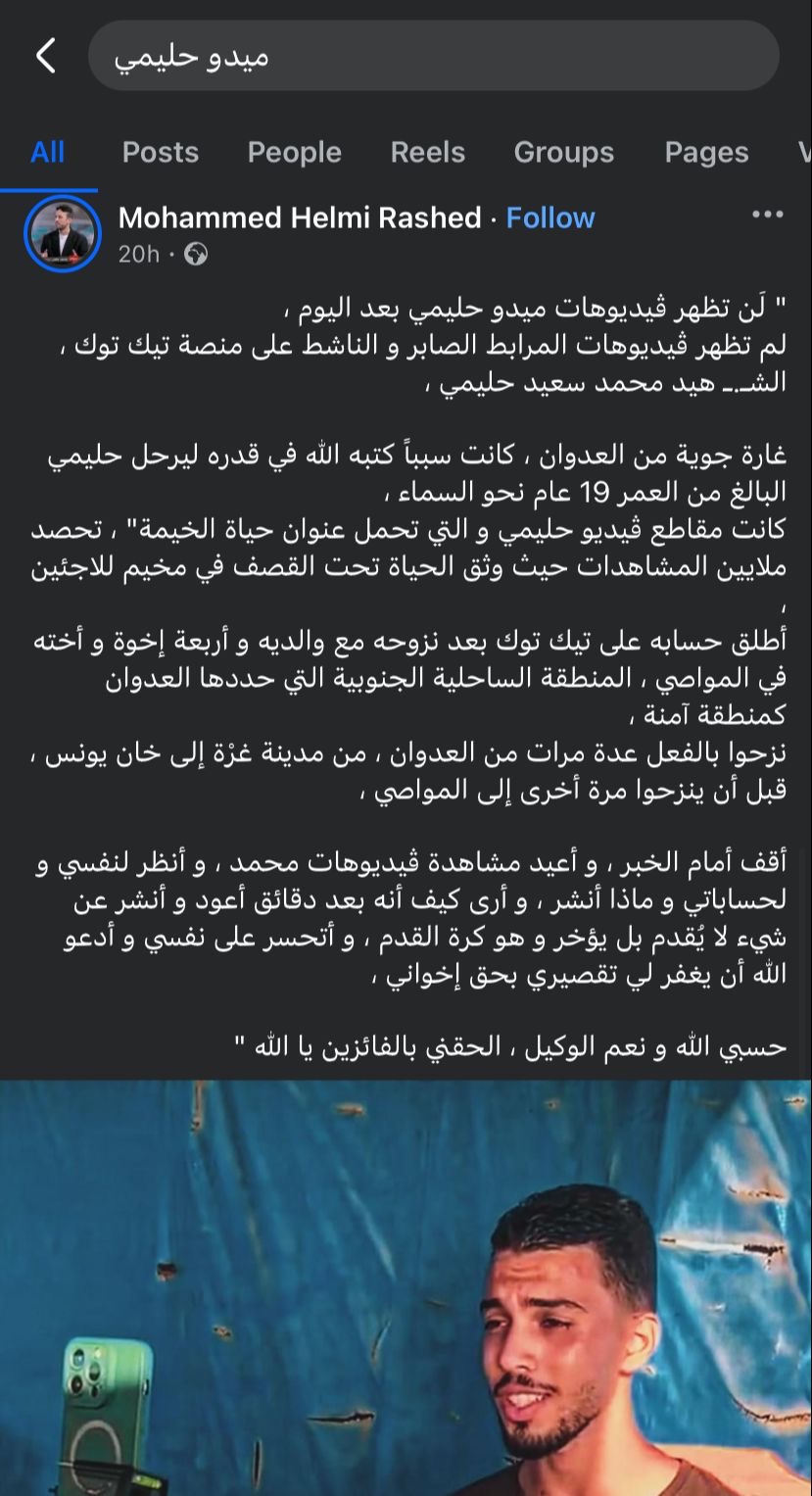 وقال أحد المتابعين، الشاب الغزاوي محمد حليمي وهو صانع محتوى ومعروف باسم ميدو ويتحدث الإنجليزية بطلاقة، هو الآن في الرفيق الأعلى، اللهم تقبله وحسبنا الله ونعم الوكيل.