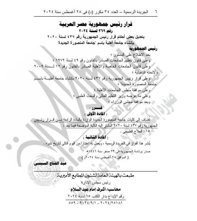 - المادة الأولى: يضاف إلى كليات جامعة المنصورة الجديدة الواردة بالمادة الرابعة من قرار رئيس الجمهورية رقم 437 لسنة 2020 المشار إليها الكلية الموضحة فيما بعد: العلاج الطبيعي.
