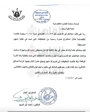 وقررت نقابة المهن الموسيقية بتغريم مصطفى زكريا محمد وشهرته مسلم وأحمد عبد الجابر محمد قاسم وشهرته فيلو بمبلغ 10 آلاف جنيه غرامة لصالح الشاكي، وتم إلغاء القرار بعد تقديم المشكو في حقهم ما يفيد قيام الشاكي باللجوء للتقاضي.