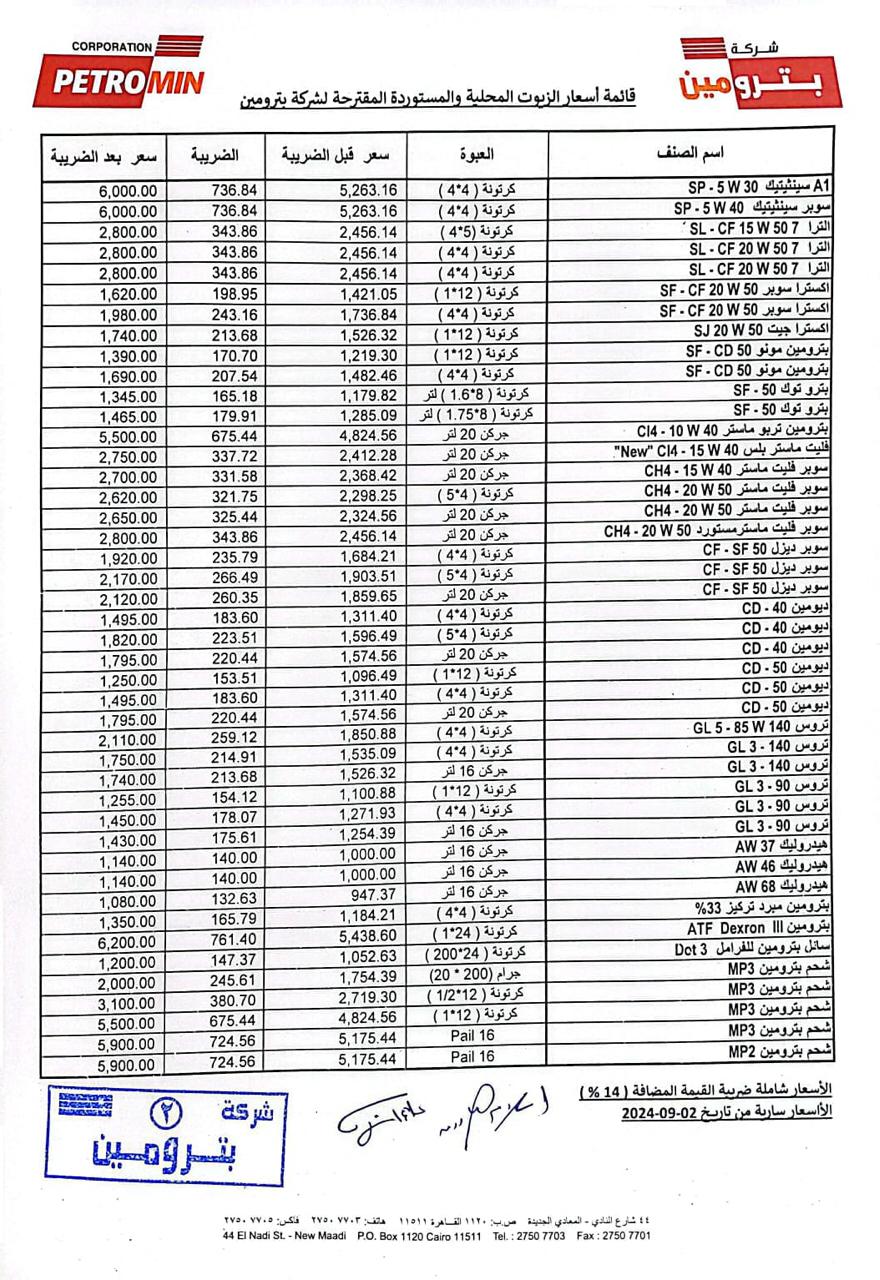 أعلنت شركتا بترومين مصر وإبسكو قوائم الأسعار الجديدة لمنتجات زيوت محركات البنزين والديزل، وزيوت التروس والهيدروليك والشحومات والمنتجات الخاصة، والتي اشتملت على زيادة أسعار بعض المنتجات مقارنة بالقوائم السابقة، وفق تجار لـ القاهرة 24.