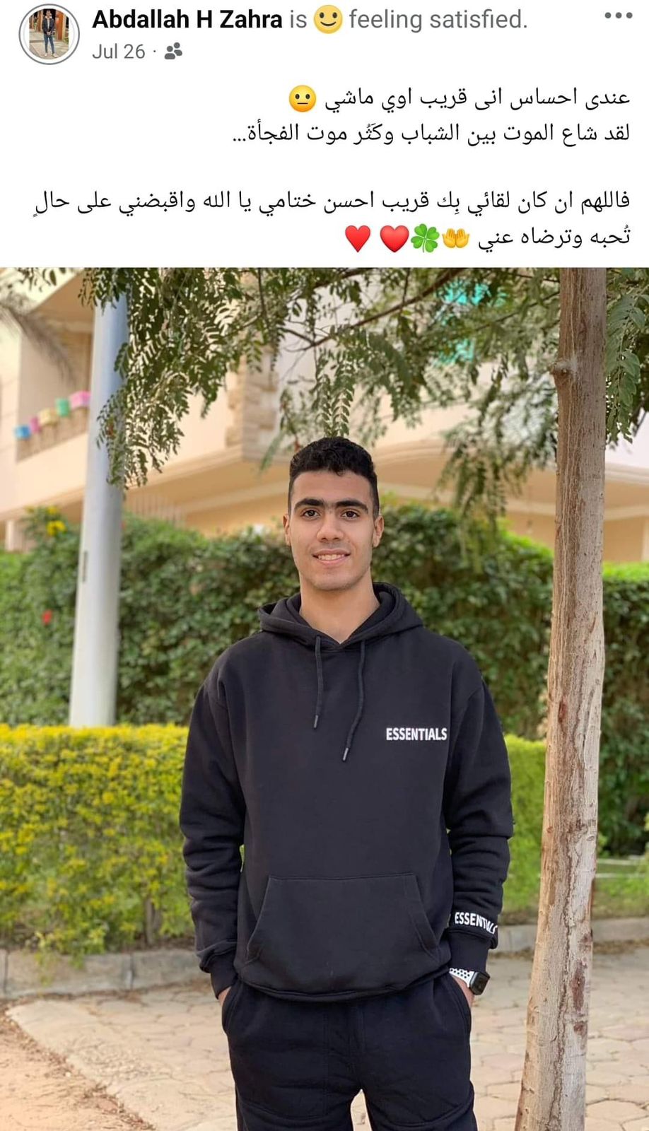 وفي وقت سابق، تداول أصدقاء الشاب الذي يدعى عبد الله زهرة منشورًا له كتبه في شهر يونيو، حيث تنبأ بوفاته في بوست قال فيه: عندي إحساس إني قريب أوي ماشي.. لقد شاع الموت بين الشباب وكثر موت الفجأة.