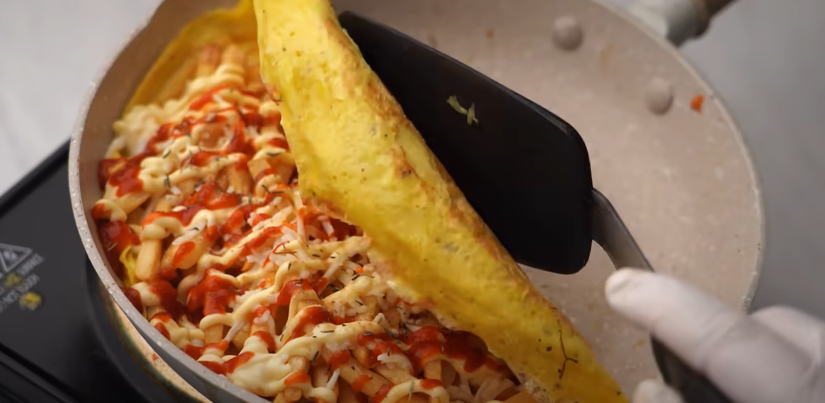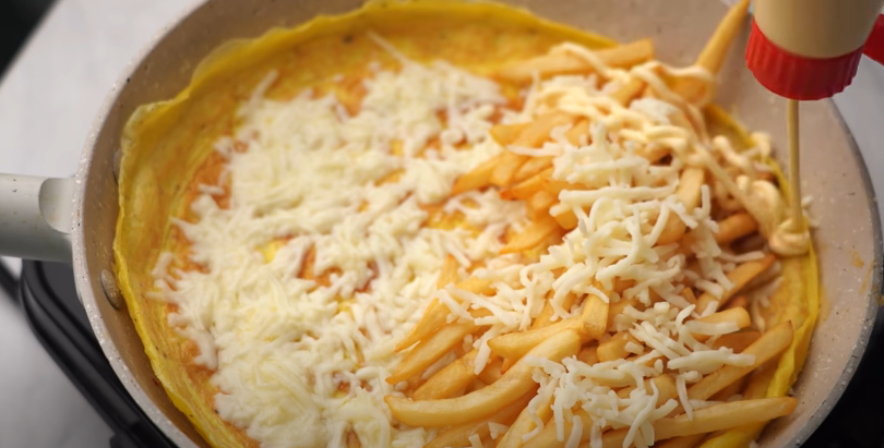 - والآن ضعي البطاطس المقلية المقرشة على إحدى جوانب البيض الأومليت ثم أضيفي الكاتشب والمايونيز.