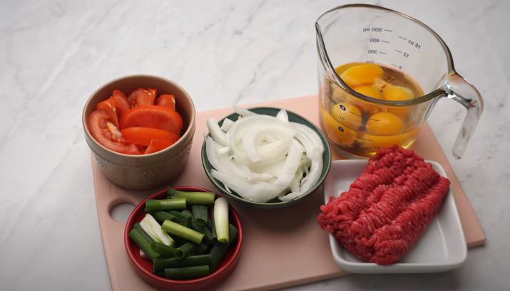 - أخفقي البيض مع رشة فلفل أسود في بولة جانبية ثم صبي البيض على اللحمة المفرومة المفرودة في الطاسة.