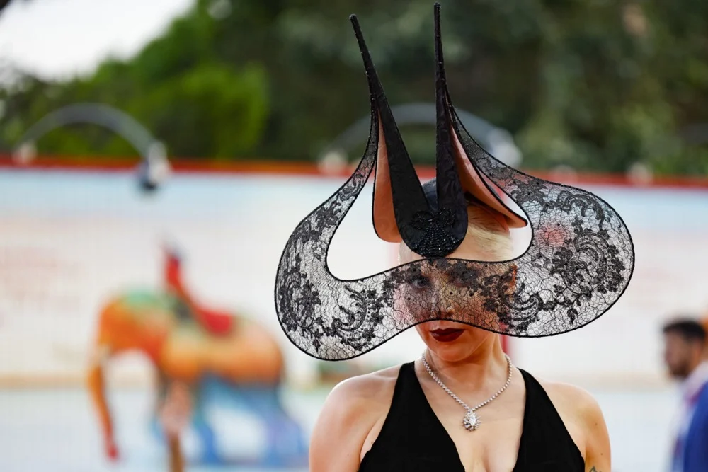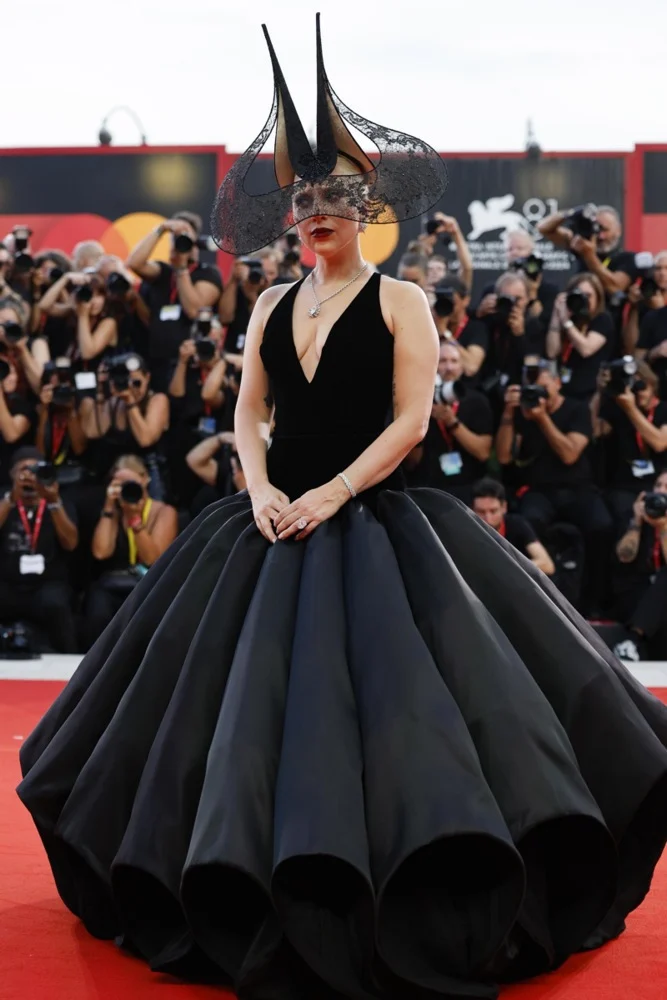 وارتدت ليدي جاجا فستانًا أسود بتنورة ضخمة وقصة صدر منخفضة، لكن أبرز ما في إطلالتها كان تاج الدانتيل اللامع من فيليب تريسي، والذي شبهه البعض بشكل القطط.