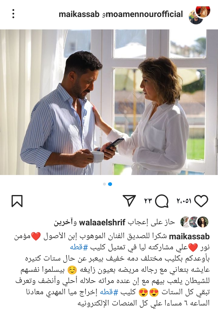 شاركت مي كساب، متابعيها صورة من كواليس تصوير أغنية قطة، عبر حسابها الشخصي بموقع انستجرام، وعلقت عليها قائلة: شكرا لصديقي الفنان الموهوب ابن الأصول مؤمن نور، على مشاركته في تمثيل مقطع قطة.