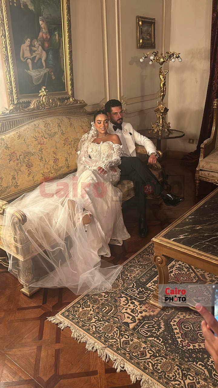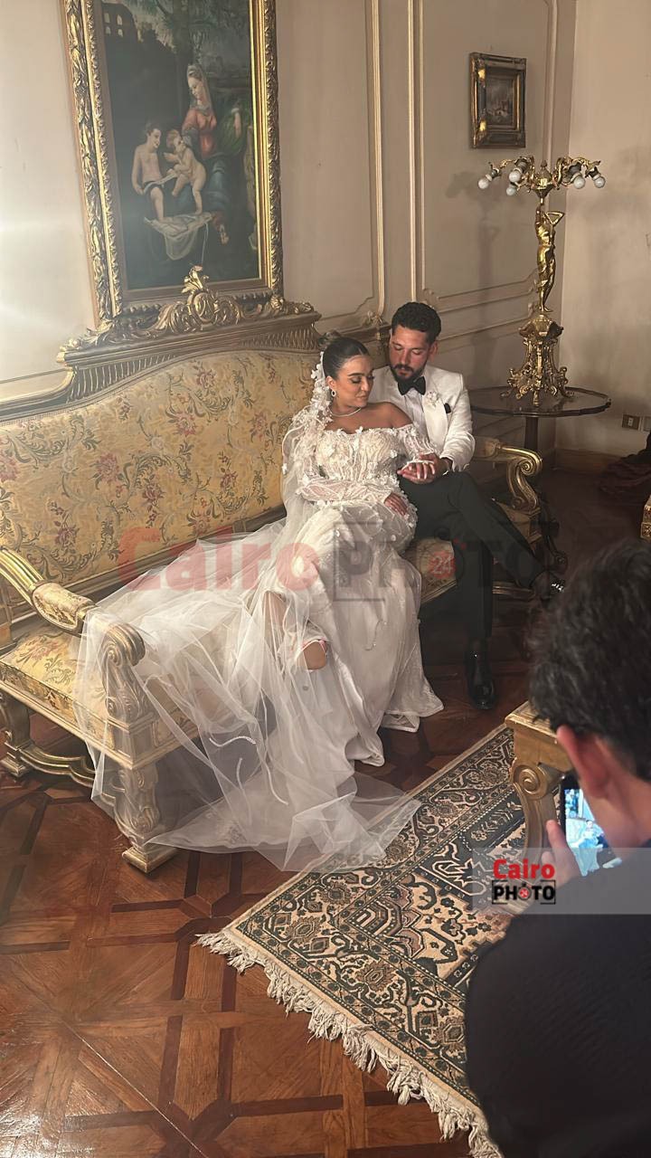 وظهرت العروس مرتدية فستانًا طويلًا بصيحة الأوف شولدر، مطرزا بشكل ناعم من أعلى، وبشعر مرفوع وميكب هادي، بينما ارتدى العوريش جاكت باللون الأوف وايت وقميص أبيض وسروال أسود.