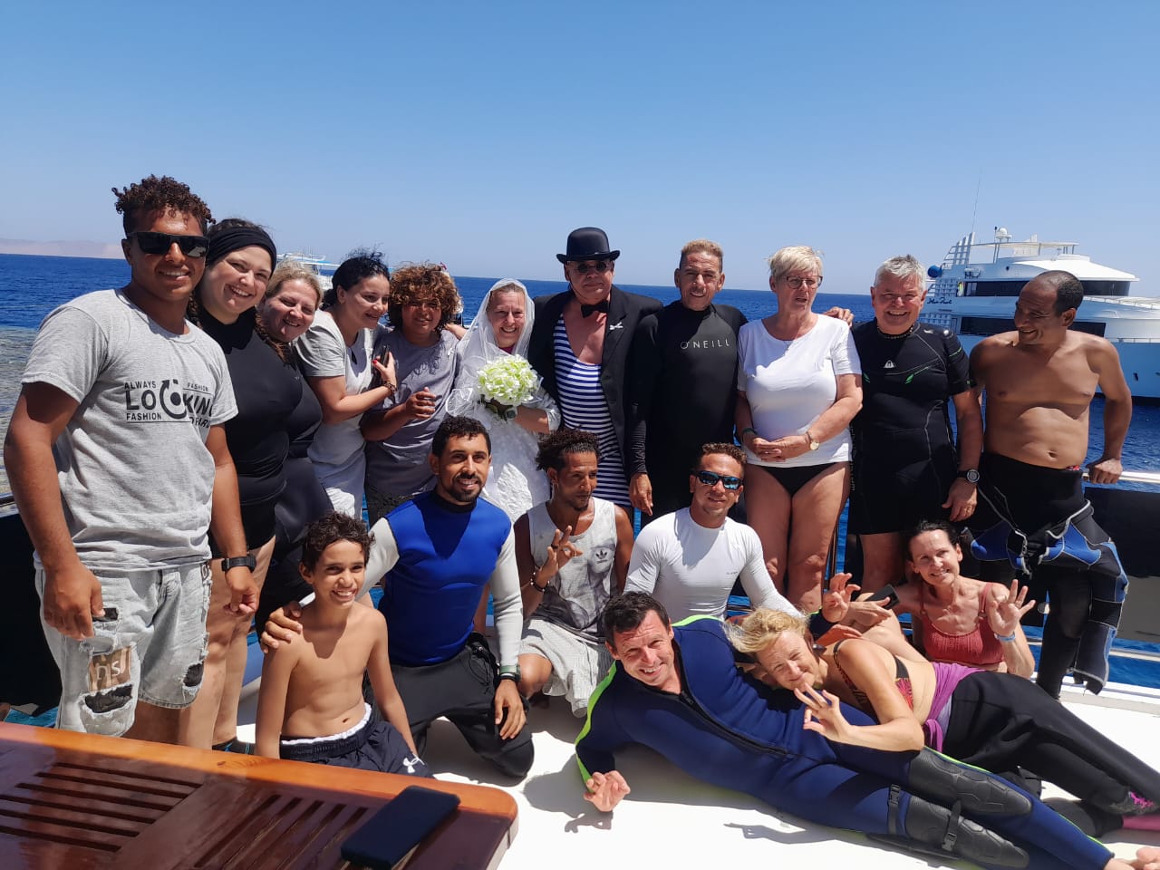 واحتفلا السائحان وسط أجواء من الفرح والسرور بمشاركة عدد من السياح الأجانب، والغطاسين والعاملين على المركب السياحي، ورقصا على أنعام الموسيقى، وتبادل الحضور التهاني والتبريكات.