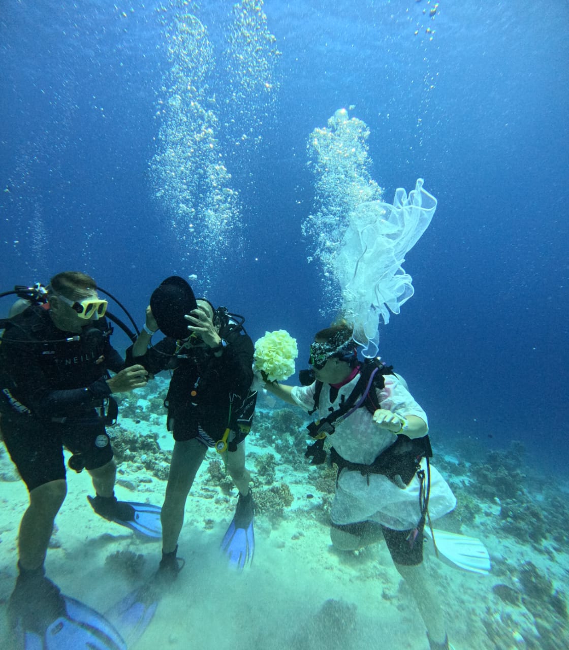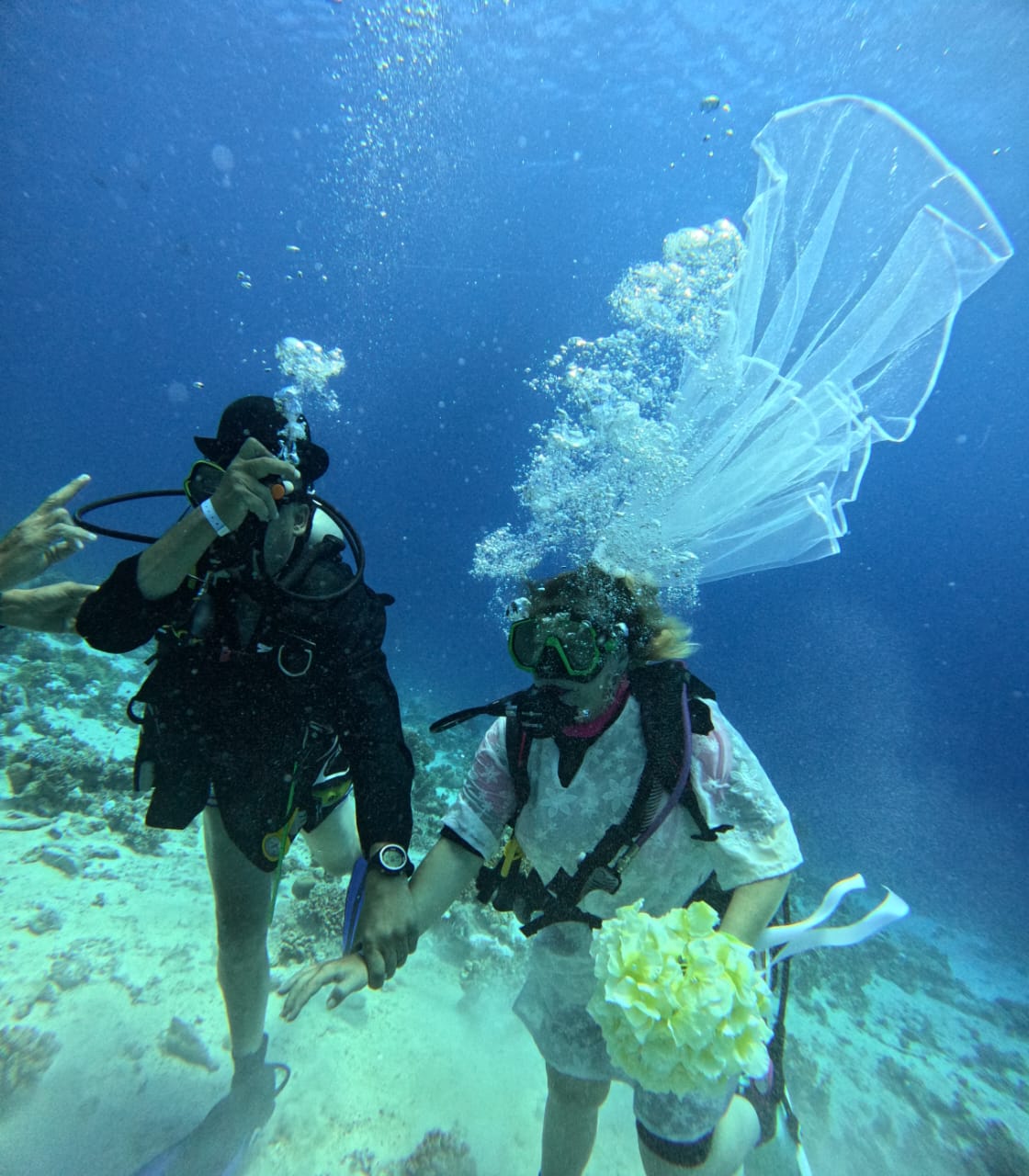 وأشار إلى ارتداء العروسين بدلة الغطس لإتمام مراسم الزفاف تحت الماء حسب رغبتهم ليقدم العريس خاتم الزفاف لعروسته تحت الماء في قاع البحر، بحضور الغطاسين والسياح الذين حرصوا على توثيق الزفاف بالتقاط الصور التذكارية.