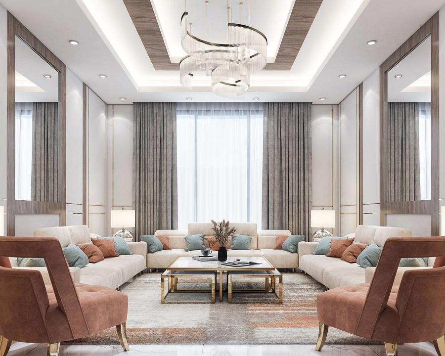 - الإضاءة: اختيار درجات الإضاءة المناسبة للمكان تعطي شكل بسيط وأنيق خاصة مع توزيع النجف والفازات بصورة متناسقة.