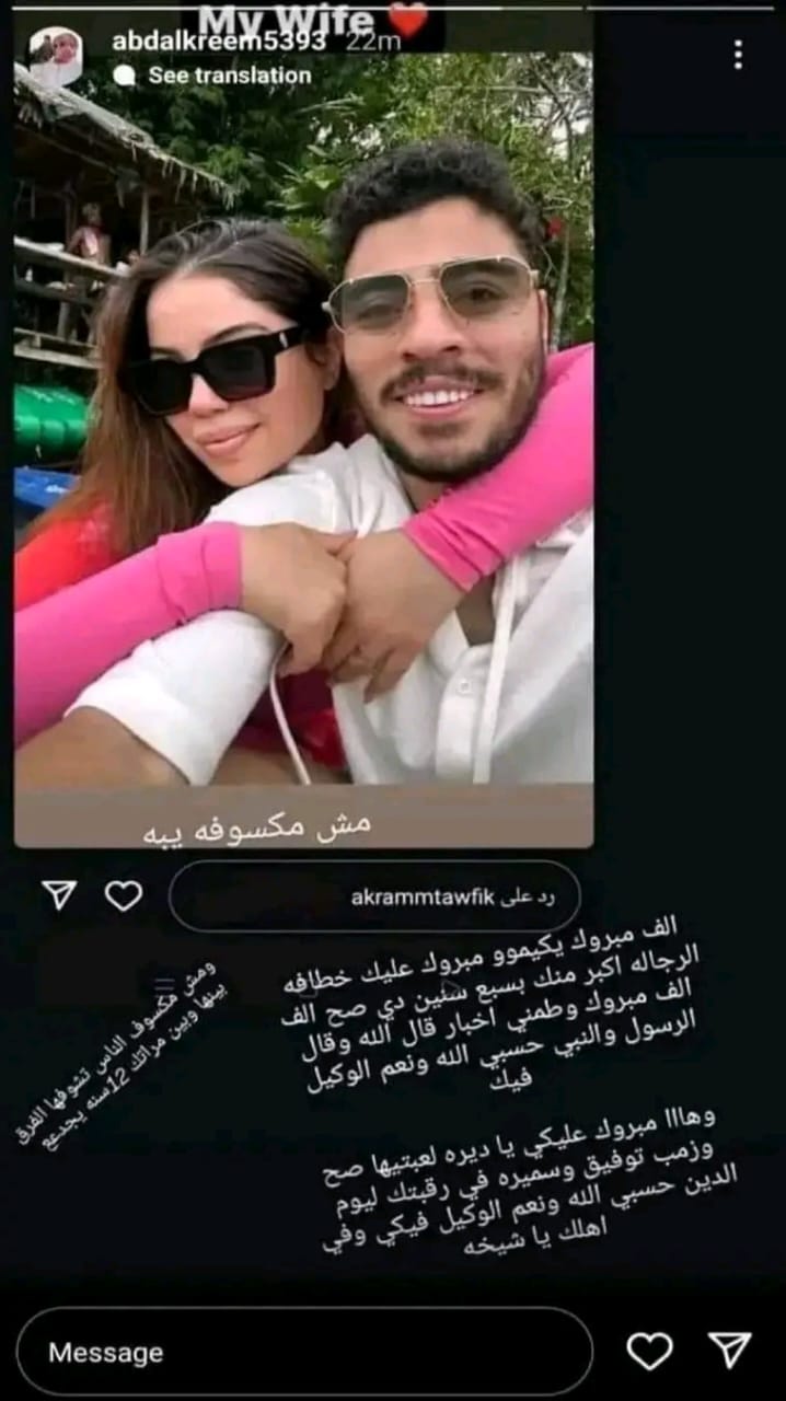 علقت شقيقة زوجة اللاعب أكرم توفيق الاولى على زواجه للمرة الثانية، بعد أن أعلن اللاعب الفريق الأول لكرة القدم بالنادي الأهلي زواجه للمرة الثانية من هدير أبو نار بـ نشر صورة مشتركة لهما عبر حسابه الرسمي على موقع إنستجرام.