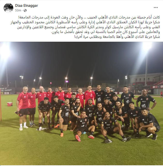 كتب ضياء الدين النجار عبر حسابه الشخصي على فيسبوك: كانت أيام جميلة بين مدرجات النادي الأهلي الحبيب، والآن حان وقت العودة إلى مدرجات الجامعة.