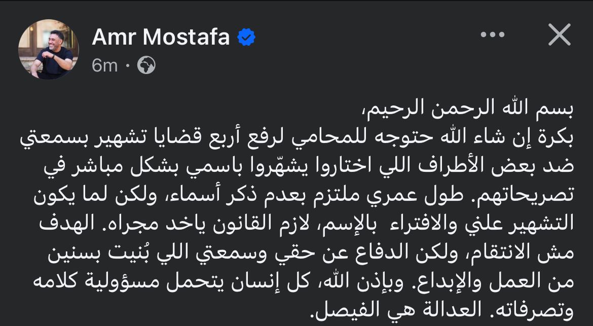 وكتب عمرو مصطفى عبر موقع فيس بوك “بكرة إن شاء الله هتوجه للمحامي لرفع أربع قضايا تشهير بسمعتي ضد بعض الأطراف اللي اختاروا يشهّروا باسمي بشكل مباشر في تصريحاتهم.