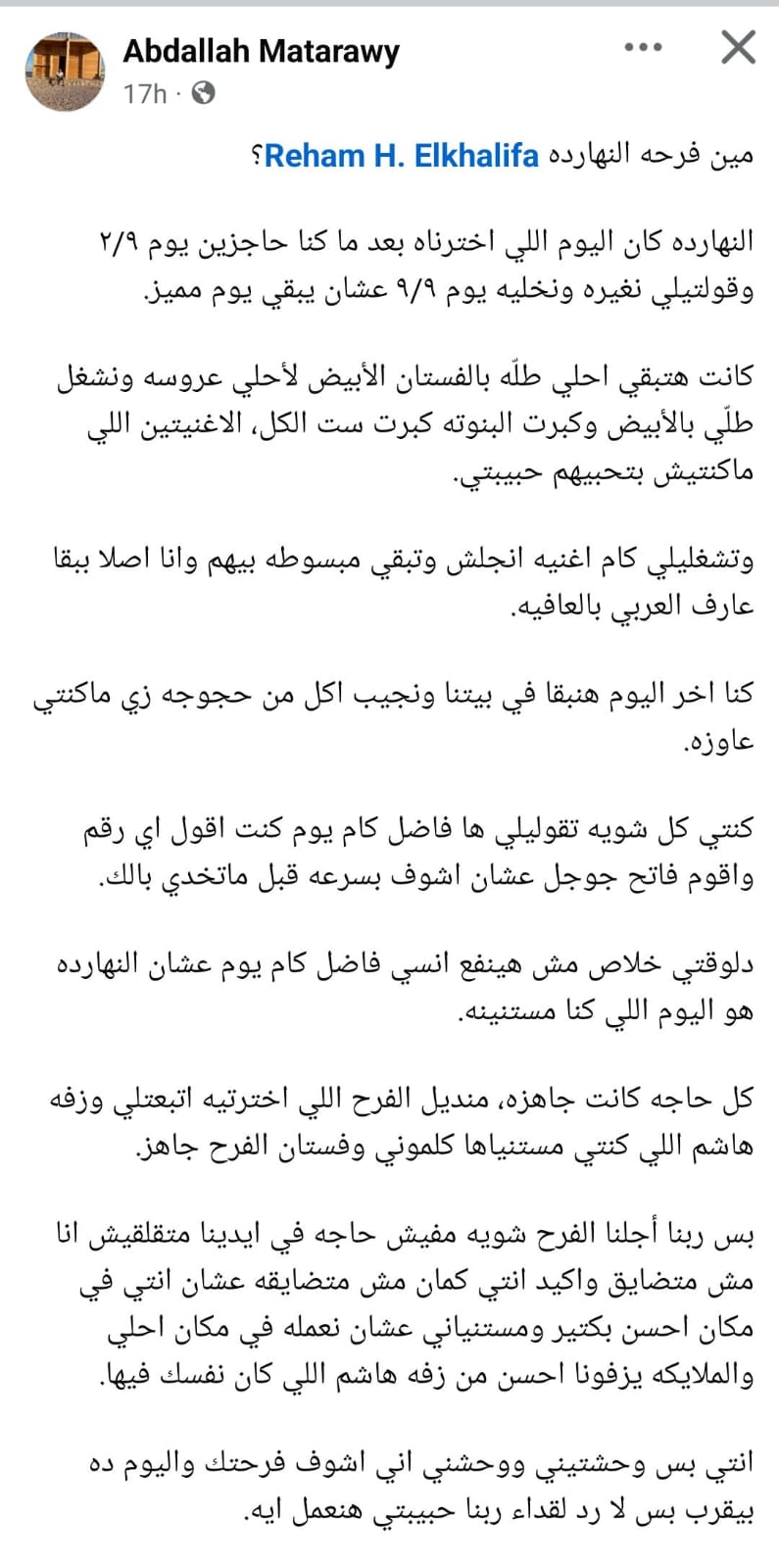 واختتم رسالته المؤثرة قائلا: إنتي بس وحشتيني ووحشني إني أشوف فرحتك واليوم ده بيقرب بس لا راد لقضاء ربنا، حبيبتي هنعمل ايه، ثم استكمل منشوره بالدعاء لها بالرحمة والمغفرة وأن يسكنها الله فسيح جناته.