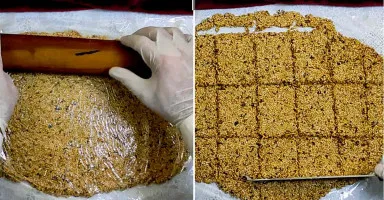 - ضعي نصف كمية خليط السمسم والقطر على ورقة زبدة وافرديه باستخدام النشابة حتى تحصلي على طبقة متساوية السمك.