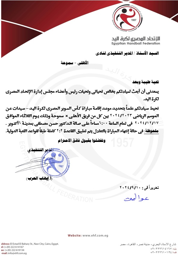 نحيط سيادتكم علمًا بتحديد موعد إقامة مباراة كأس السوبر المصري لكرة اليد - سيدات الموسم الرياضي 2023-2024 بين كل من فريق الأهلي - سموحة وذلك يوم الثلاثاء الموافق 2024/12/17في تمام الساعة 6:00 مساءاً على صالة الدكتور حسن مصطفى بمدينة 6 أكتوبر.
