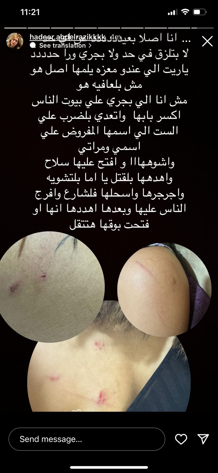وأشارت هدير عبد الرازق إلى تعرضها لتهديدات قائلة: أنا نفسي حقيقي أصرخ وأتكلم بس للأسف انا مهددة بالقتل أو الحبس بطريقة أبشع من اللي قبلها، أو ممكن أتشوه بمياه النار، لكن أنا مش هسكت وهتكلم وهحكي كل حاجة يا حسين ومش هسيب حقي.