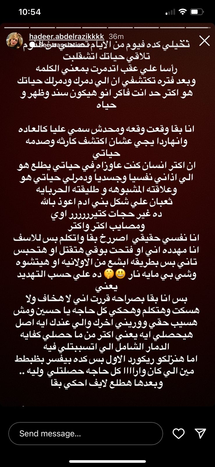 وعبر حسابها الشخصي بانستجرام، كشفت هدير عبد الرازق تفاصيل جديدة خاصة بالمتسبب في تدمير حياتها قائلة: تخيلي كده في يوم من الأيام تصحي تلاقي حياتك تدمرت بمعنى الكملة، وبعد كده تكتشفي إن اللي دمر حياتك هو أكثر حد كنت فاكر أنه هيكون سند ليكي.