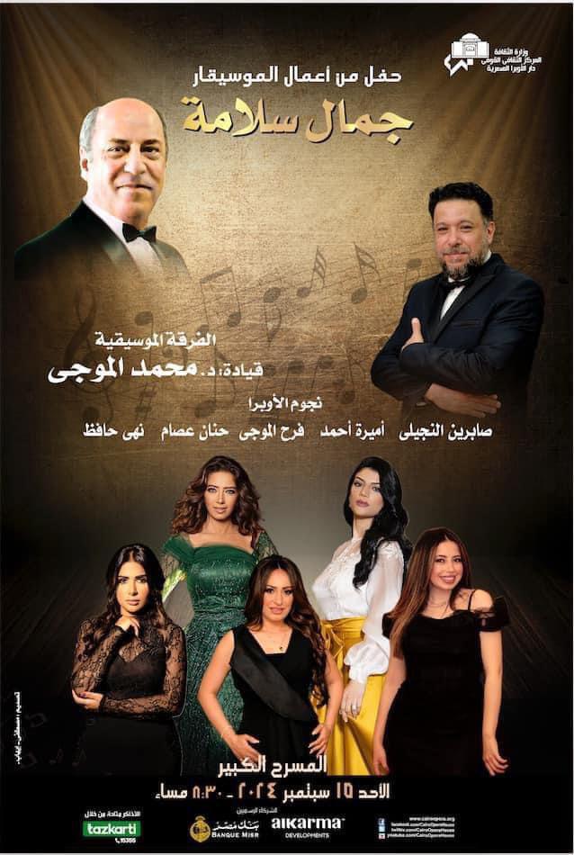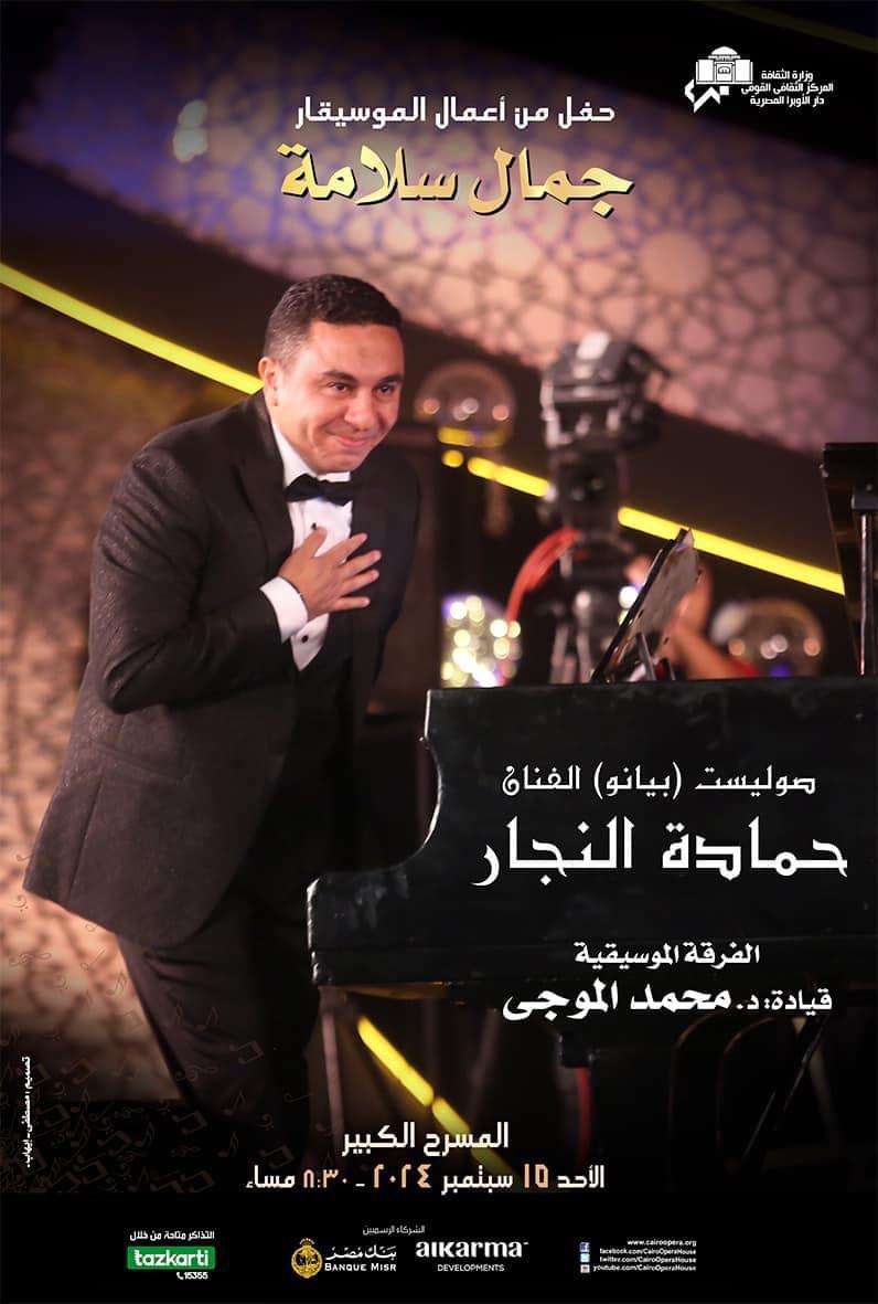ضمن توجهات الثقافة المصرية للاحتفاء برموز وأعلام الموسيقى تنظم دار الأوبرا، برئاسة الدكتورة لمياء زايد حفلًا لأعمال الموسيقار الراحل جمال سلامة، تحييه الفرقة الموسيقية بقيادة المايسترو الدكتور محمد الموجي، بـ مشاركة نجوم الأوبرا صابرين النجيلي، أميرة أحمد، فرح الموجي، حنان عصام، نهى حافظ، ياسر سليمان، أحمد عفت، وليد حيدر ومصاحبة صوليست البيانو الفنان حمادة النجار، وذلك في الثامنة والنصف مساء الاحد 15 سبتمبر على المسرح الكبير.
