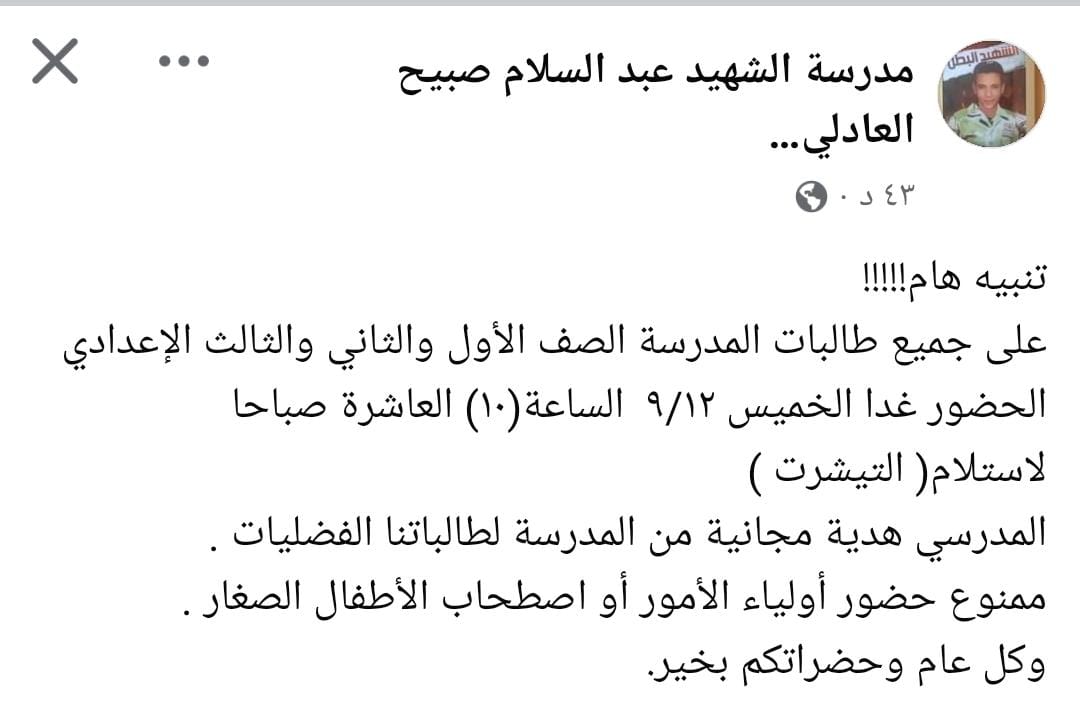 ونشرت إدارة مدرسة الشهيد عبد السلام صبيح العادلي الإعدادية بقرية ساقية أبو شعرة، منشورا عبر صفحتها على موقع التواصل الاجتماعي فيسبوك تدعو فيه طالبتها للحضور غدا الخميس للمدرسة، لاستلام التيشرت وذلك بشكل مجاني تام.
