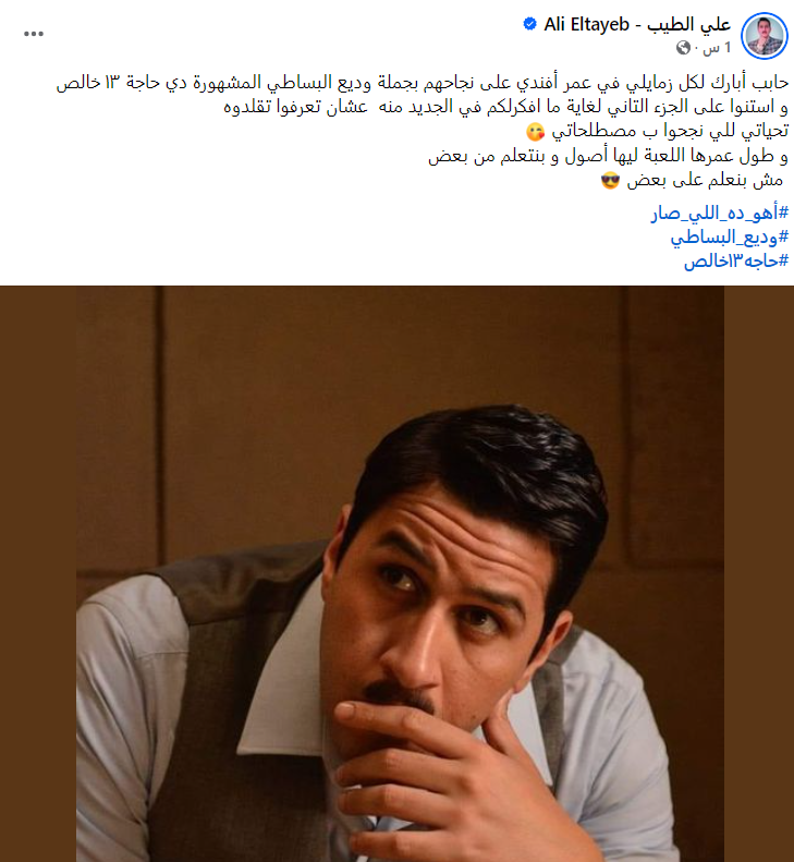 وكتب علي الطيب منشورًا، عبر حسابه الشخصي بموقع التواصل الاجتماعي، فيس بوك، قال فيه: حابب أبارك لكل زمايلي في عمر أفندي على نجاحهم، بجملة وديع البساطي المشهورة دي حاجة 13 خالص، واستنوا على الجزء التاني لغاية ما أفكرلكم في الجديد منه عشان تعرفوا تقلدوه، تحياتي للي نجحوا بمصطلحاتي، وطول عمرها اللعبة ليها أصول وبنتعلم من بعض، مش بنعلم على بعض.