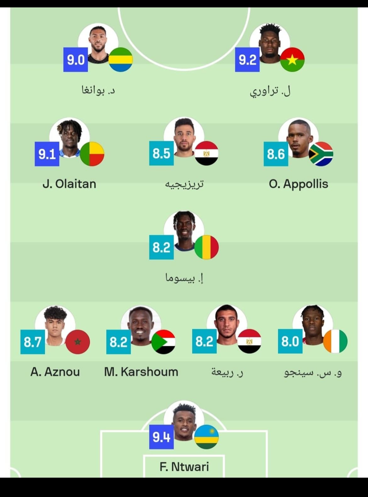 خط الوسط: إيف بيسوما (مالي)- أبوليس (جنوب إفريقيا)- محمود حسن تريزيجيه (مصر)- أولايتان (بنين).