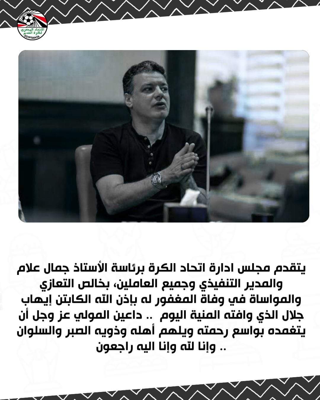 ويتقدم مجلس إدارة اتحاد الكرة برئاسة جمال علام والمدير التنفيذي وجميع العاملين، بخالص التعازي والمواساة في وفاة المغفور له بإذن الله الكابتن إيهاب جلال الذي وافته المنية اليوم، داعين المولي عز وجل أن يتغمده بواسع رحمته ويلهم أهله وذويه الصبر والسلوان، وإنا لله وإنا اليه راجعون.
