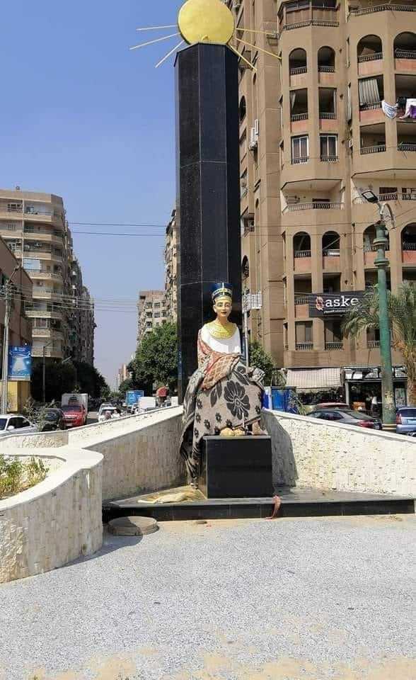 متغطية بالبطانية.. تمثال مثير للجدل للملكة نفرتيتي بأحد ميادين المنيا| صور