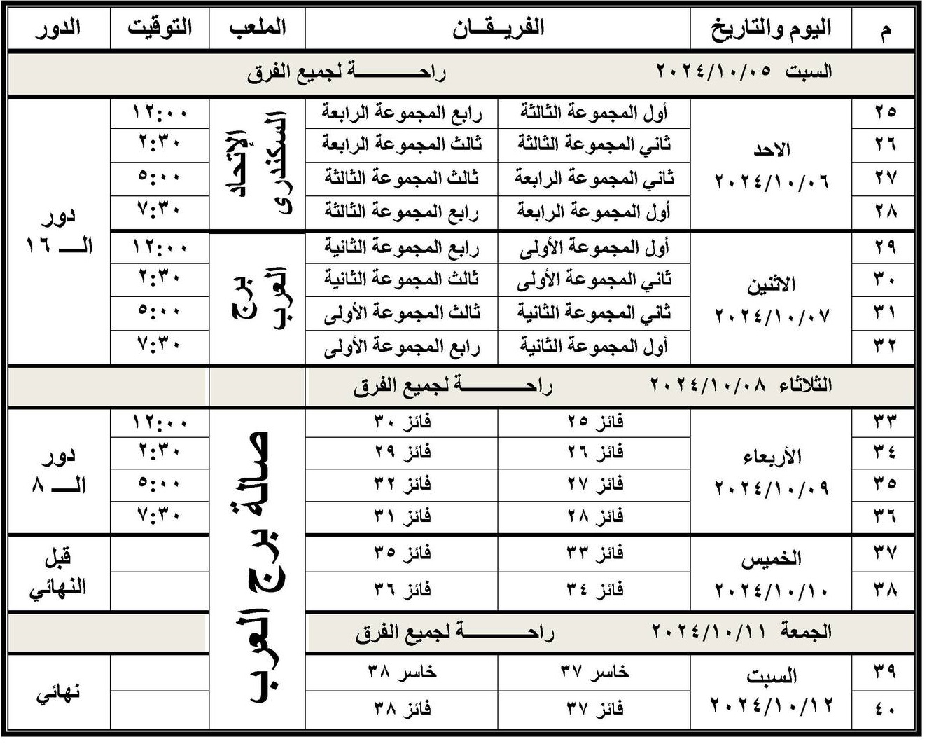 - السيب أمام القادسية - في تمام الرابعة والنصف مساء على صالة الاتحاد السكندري