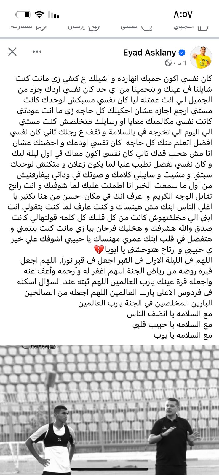 وكتب العسقلاني على صفحته الشخصية عبر موقع التواص الاجتماعي فيس بوك: كان نفسي أكون جنبك النهاردة، وأشيلك على كتفي زي ما كنت شايلنا في عينك وبتحمينا من أي حد.. كان نفسي أردك جزء من الجميل اللي أنت عمتله ليا، كان نفسي مسيبكش لوحدك.. كنت مستني أرجع إجازة عشان أحكيلك كل حاجة زي ما أنت عودتني.