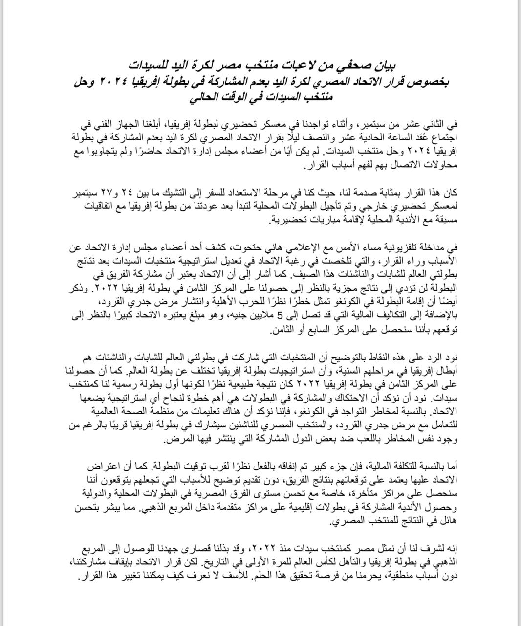 أصدر لاعبات منتخب مصر لكرة اليد بيانًا بخصوص قرار الاتحاد المصري لكرة اليد بعدم المشاركة في بطولة إفريقيا 20224 وحل منتخب السيدات في الوقت الحالي.