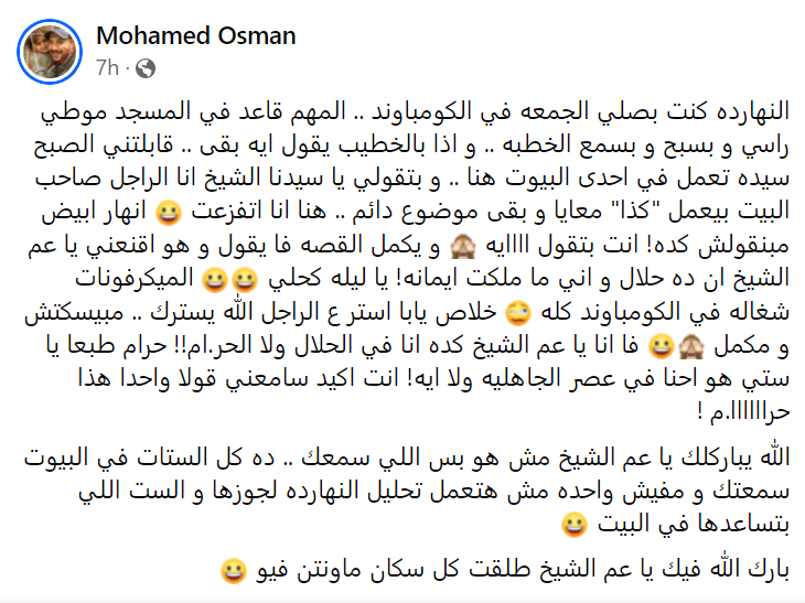 وأشار صاحب المنشور إلى أن الخطبة أثارت توتر جميع الرجال الذين سيواجهون مشكلة مع زوجاتهم، فيقول: الميكرفونات شغاله في الكومباوند كله، خلاص يابا استر ع الراجل الله يسترك، مبيسكتش ومكمل، الله يباركلك يا عم الشيخ، ده كل الستات في البيوت سمعتك ومفيش واحدة مش هتعمل تحليل النهاردة لجوزها والست اللي بتساعدها في البيت، بارك الله فيك يا عم الشيخ طلقت كل سكان ماونتن فيو.