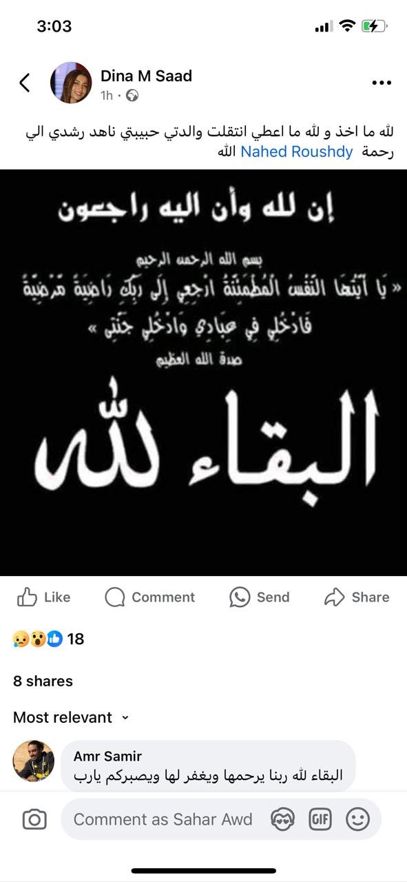 وكانت قد أعلنت ابنة الفنانة ناهد رشدي عن وفاة والدتها عبر حسابها على موقع فيسبوك.