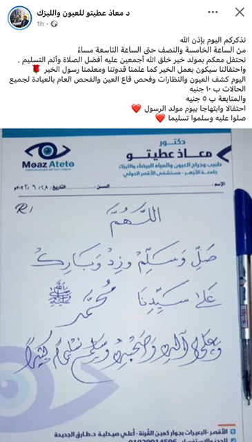 وتابع الدكتور معاذ على صفحتة: واحتفالنا سيكون بعمل الخير كما علمنا قدوتنا ومعلمنا رسول الخير، اليوم كشف العيون والنظارات وفحص قاع العين والفحص العام بالعيادة لجميع الحالات ب10جنيها، والمتابعة ب ٥ جنيها احتفالا وابتهاجا بيوم مولد الرسول صلوا عليه وسلموا تسليما.