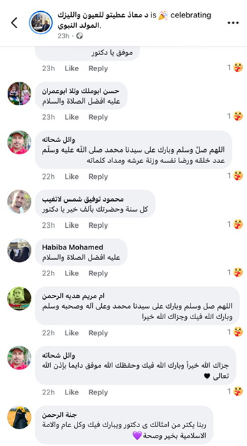 وانهمرت التعليقات على صفحة الطبيب مهنئين لة بالمولد النبوي الشريف، وشاكرين له جميل صنعه، وداعين الله له بالخير والبركة.