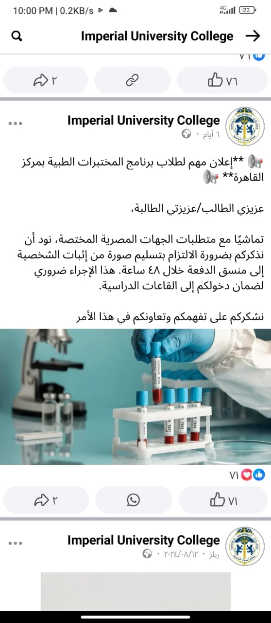 وواصل نص الرسالة: يا ريت من كل طلاب دفعتنا الموجدين في مصر التوجه لمركز الكلية، عشان عايزين الناس تتناقش مع دكتور مهلب في موضوع الدراسة والرسوم وما إلى ذلك.