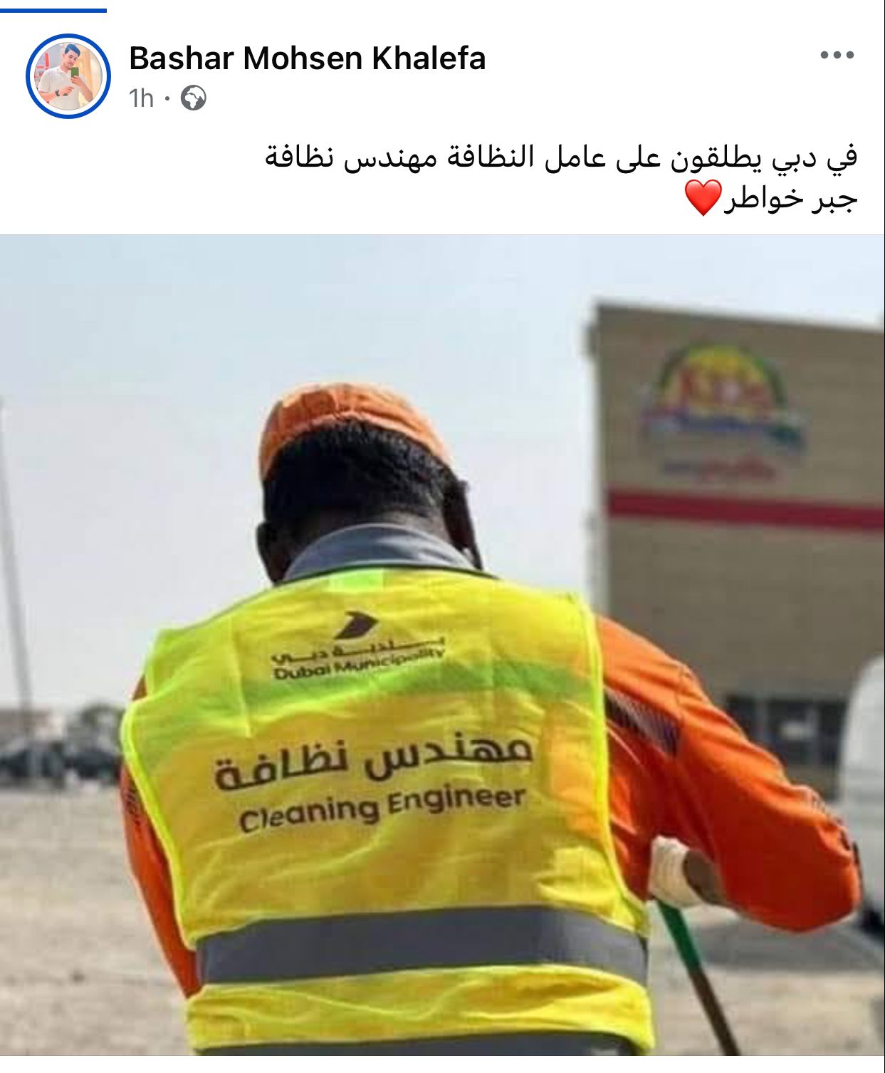 وظهر عامل نظافة في صورة من أحد الشوارع العامة في دبي بدولة الإمارات العربية المتحدة، حاملًا لـ لقب مهندس النظافة، مما أثار تعليقات ومُشاركات مستخدمي منصة فيسبوك للتواصل الاجتماعي، مُعلقين: جبر للخواطر.